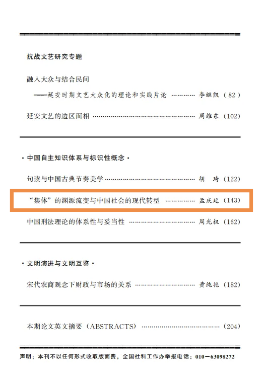 祝贺!我院孟庆延教授在《中国社会科学》期刊上发表论文《“集体”的渊源流变与中国社会的现代转型》。